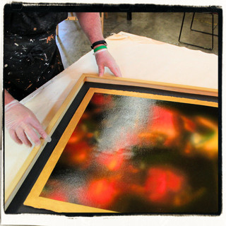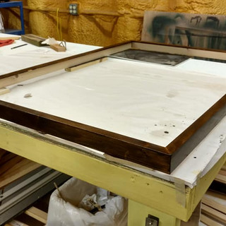 My friend Bob giving me a hand in my woodshop along with samples of my framed artwork